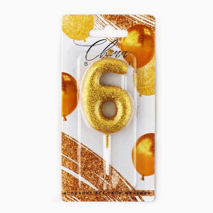 10103219 Свеча-цифра в торт блестящая «6», золото, 4 х 10 см