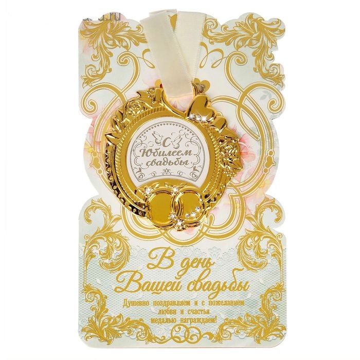 Хотите ярко и необычно поздравить близких людей с годовщиной такого важного дня? Изделие подчеркнёт всю торжественность этого события. Медаль эксклюзивной формы изготовлена из металла под золото и украшена великолепными сияющими стразами. Она преподносится на нежной оригинальной резной открытке с золотым тиснением. Внутри написаны красивые искренние поздравления!