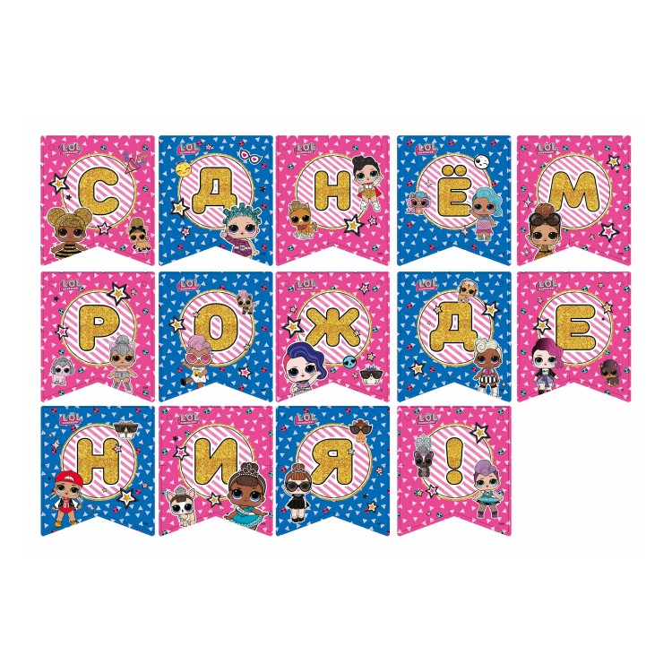 Гирлянда для праздничного декора помещения в розово-золотых оттенках с изображением очаровательных куколок Лол (lol). Гирлянда с надписью «С днем рождения!» состоит из 14 отдельных флажков, изготовленных из цветного мелованного картона, каждый флажок имеет размер 12*14 см, общая длина гирлянды 200 см. Флажки требуют предварительного нанизывания на ленту, которая также входит в комплект.