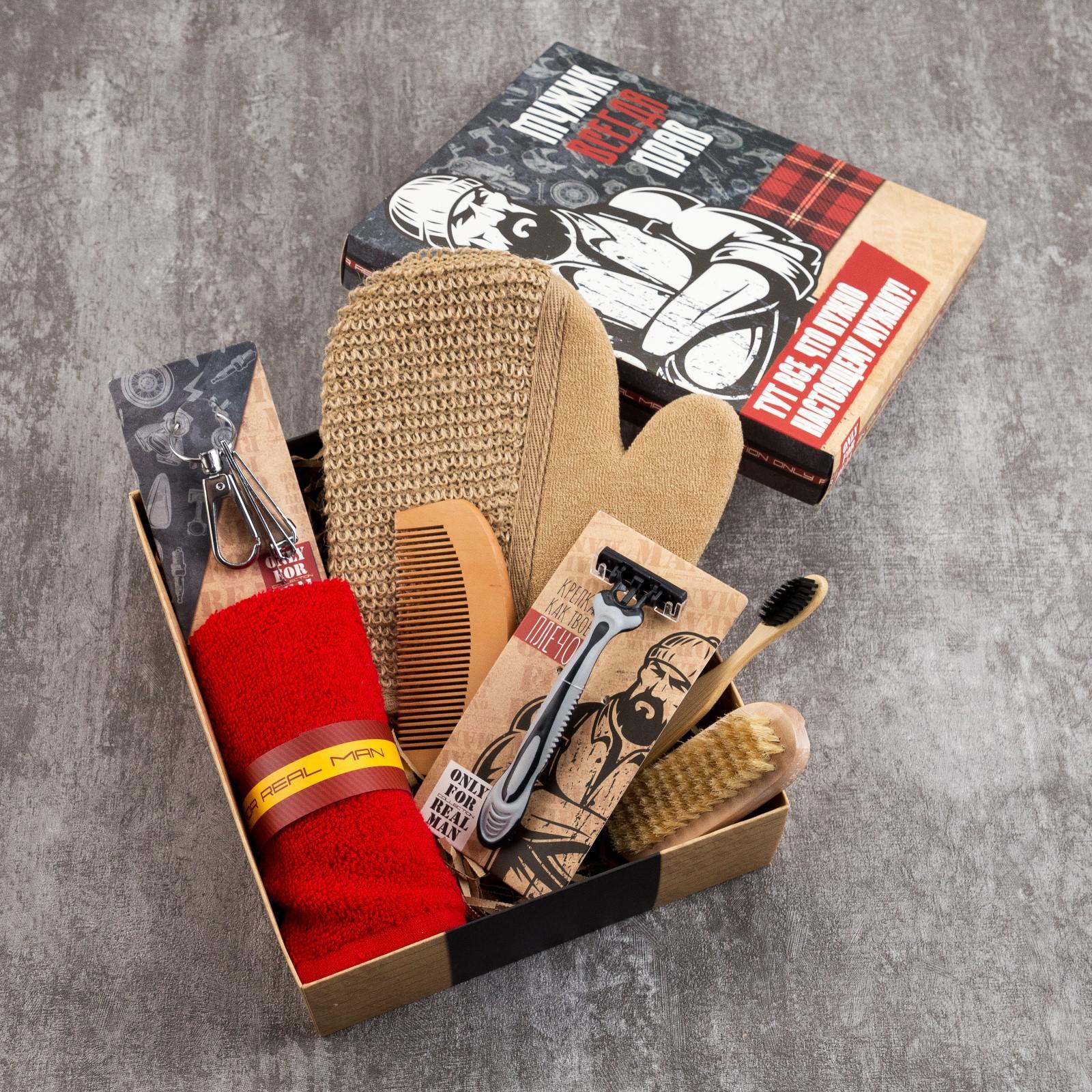 Набор подарочный «Мужик всегда прав» полотенце и акс (7 предметов: Бритвенный станок, Зубная щётка, Мочалка, Полотенце, Принадлежности для маникюра, Расчёска, Щётка)