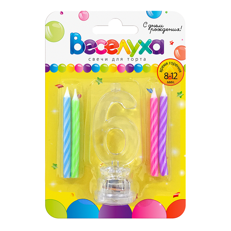 701007-6 Набор тортовых классических свечей с мигающим держателем Цифра «6»