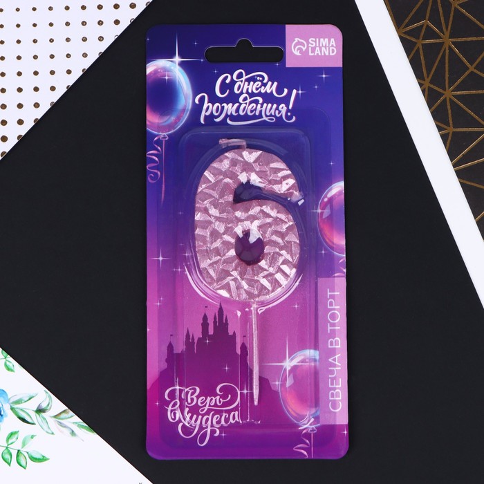 7479356 Свеча-цифра для торта «6», розовая, 4 х 10 см.