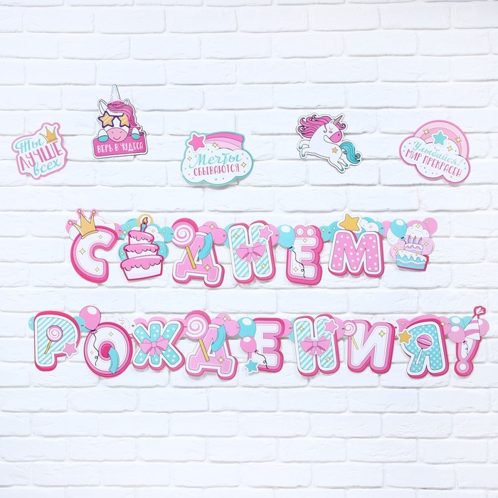7733114 Гирлянда на люверсах с украшениями 5 шт. «С Днем рождения!», нежно-розовый, длина 245 см