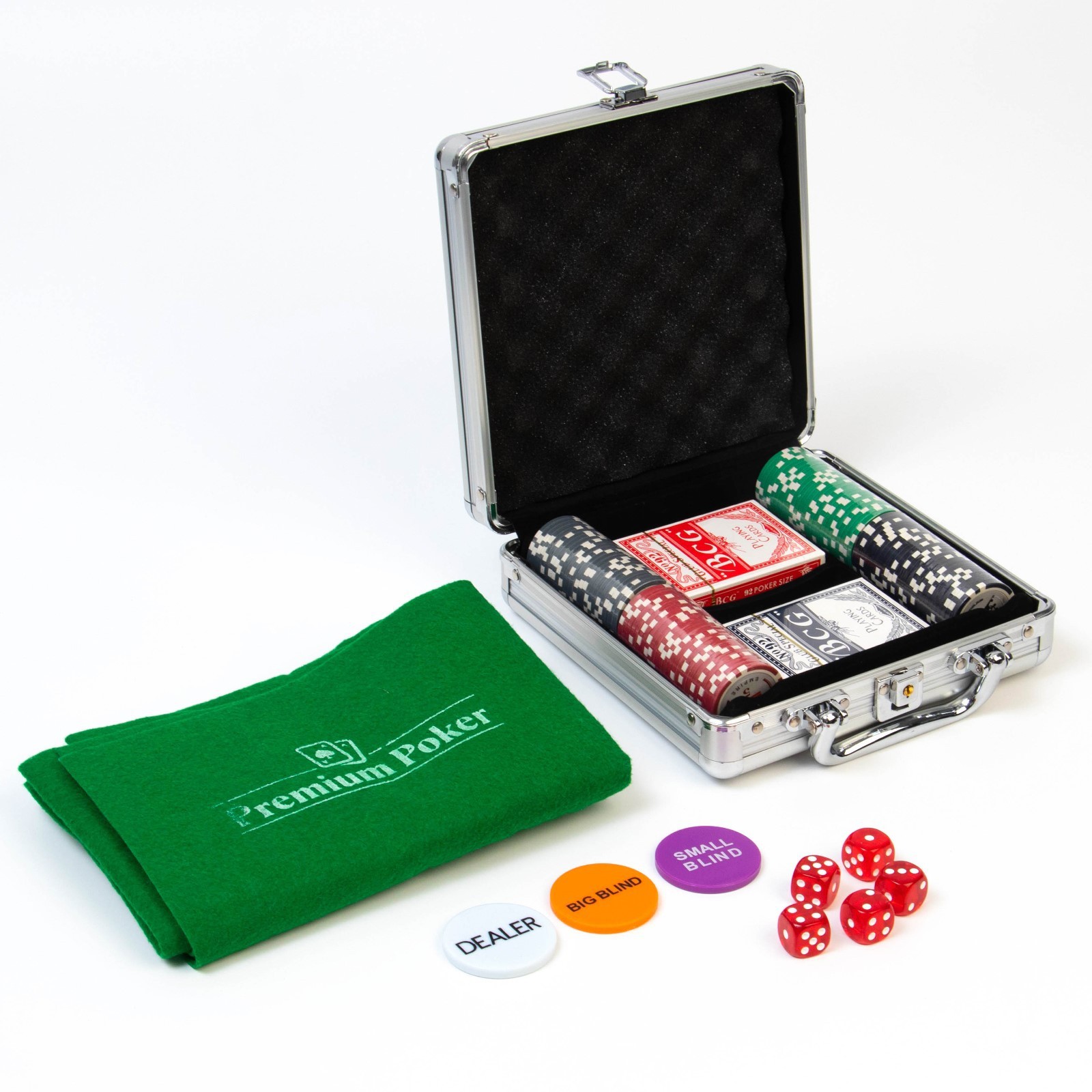 9225153 Покер в кейсе (100 фишек, 5 кубиков, 2 колоды карт), с номиналом