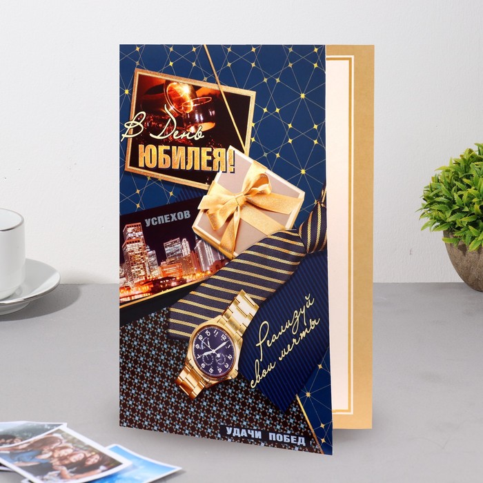 9429220 Открытка «С Юбилеем!» тиснение, часы, галстук, 29х19,5 см