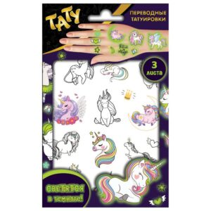 299993 Наклейки — татуировки светящиеся «Единороги», 3 листа