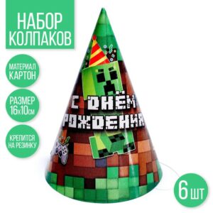 9520333 Колпак бумажный «С днём рождения» пиксели, набор 6 штук
