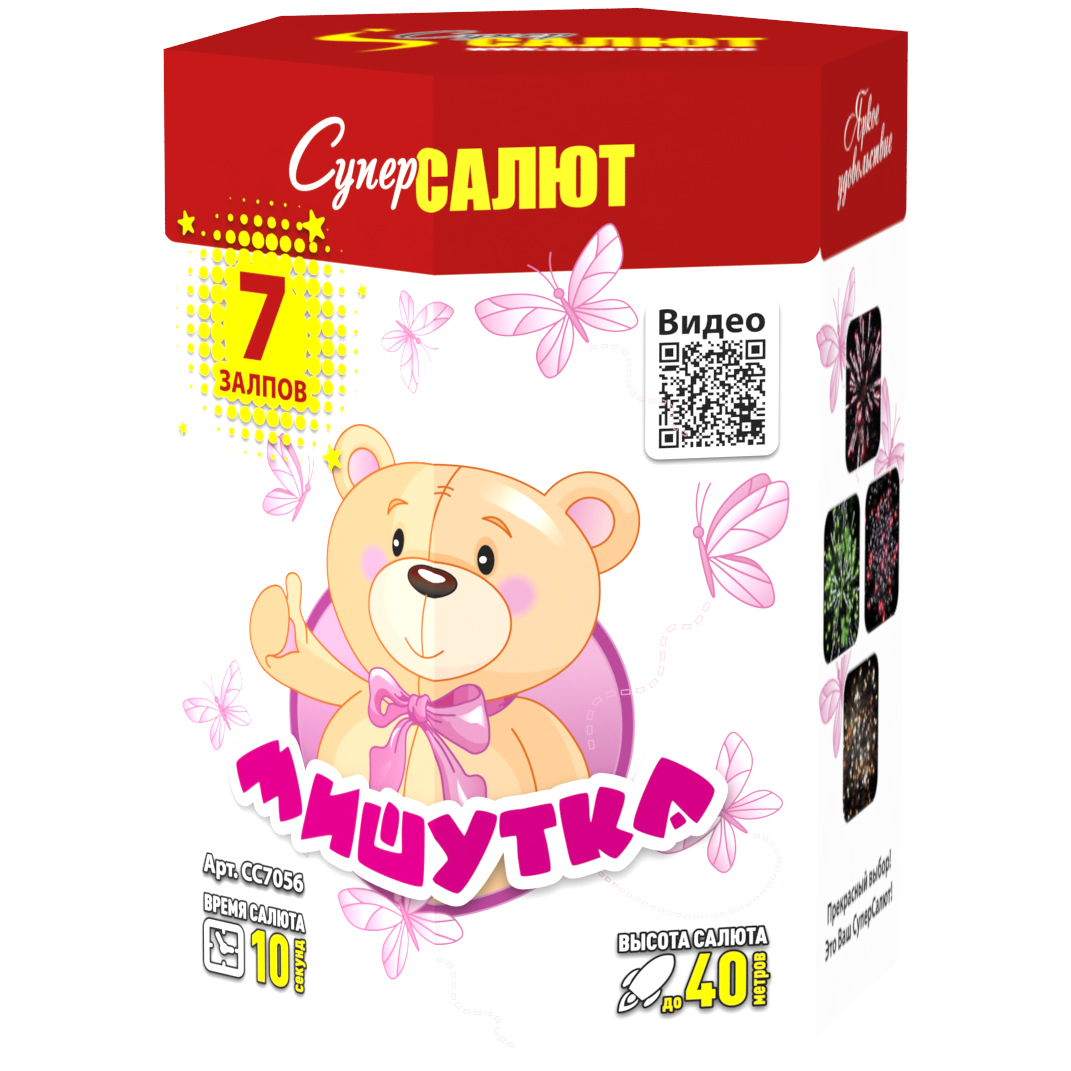 Батарея салютов, калибр 0,8″, 7 залпов, время работы до 10сек, высота до 30м.