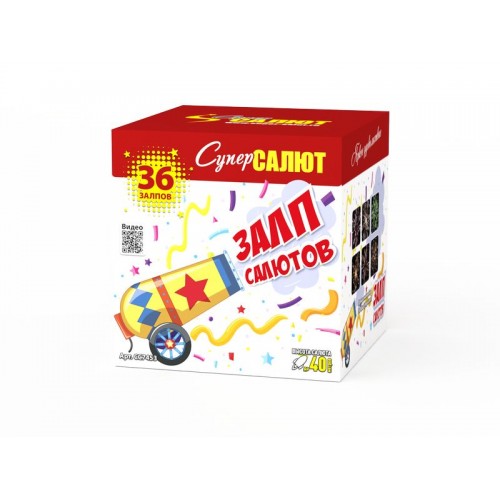 Батарея салютов, калибр 1″, 36 залпов. Время работы до 50 сек, высота взлета до 40м.