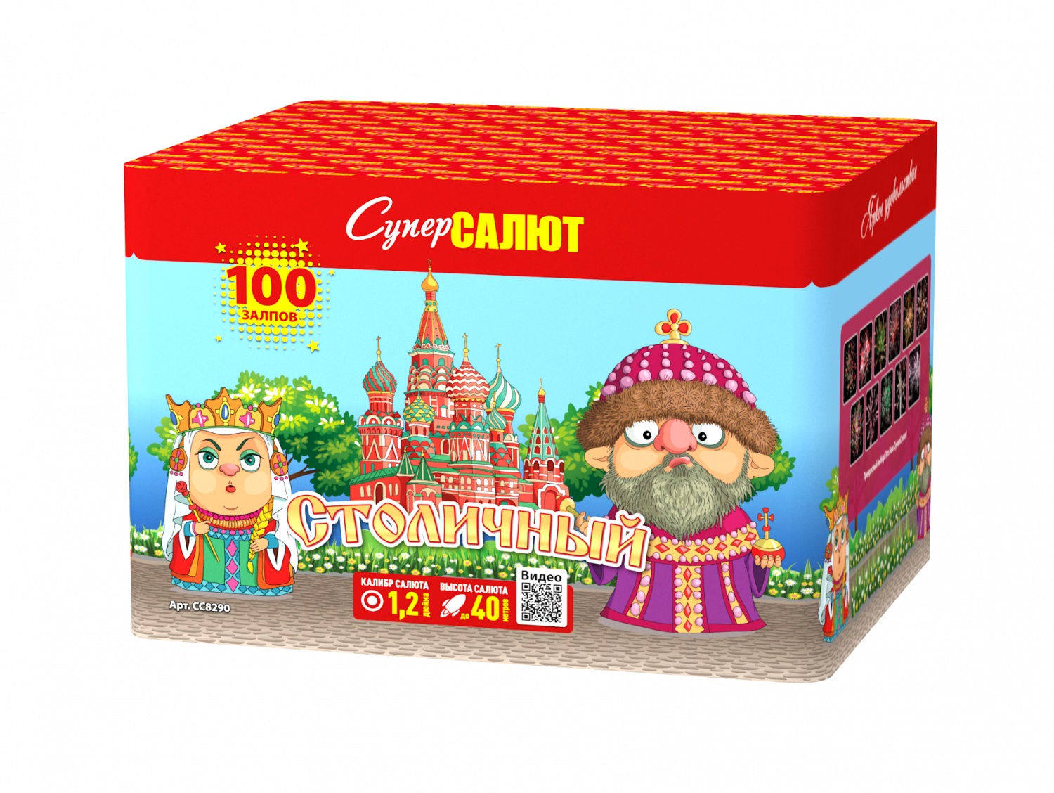 Батарея салютов, калибр 1,25″, 100 залпов, время работы до 96сек, высота взлета до 40м.