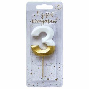 6503 Свеча тортовая цифра «3» бело-золотая витая