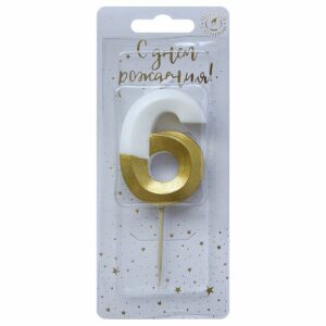 6506 Свеча тортовая цифра «6» бело-золотая витая