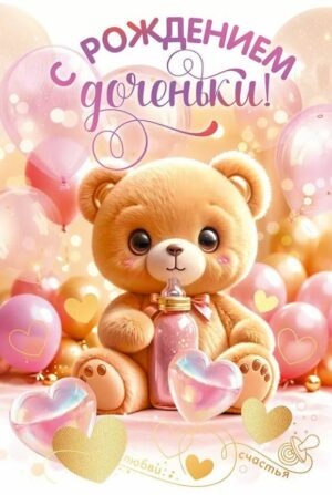 90000158 Открытка «С рождением доченьки» Мишка А5