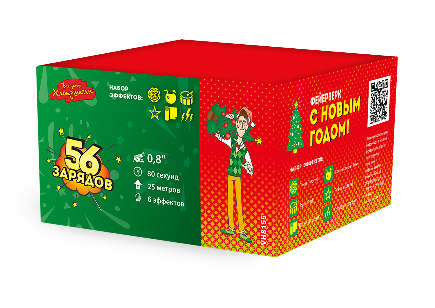 Батарея салютов, калибр 0,8″, 56 залпа, время работы до 80сек, высота до 20м.